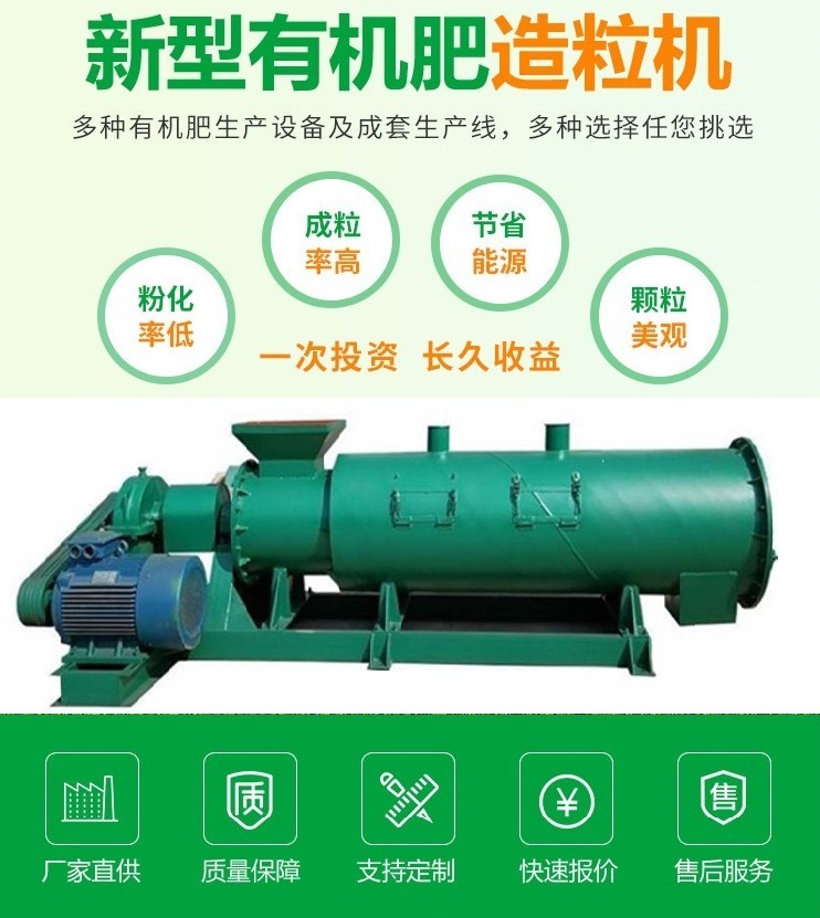 采用新型有機(jī)肥造粒機(jī)對(duì)物料進(jìn)行制粒。本系統(tǒng)的作用是將粉碎配料混合完備后的物料制成顆粒。制粒適宜采用圓盤造粒機(jī)、攪齒造粒機(jī)、或者新型攪齒轉(zhuǎn)股三組合造粒機(jī),其優(yōu)點(diǎn)是:原料適應(yīng)性廣,尤其適合有機(jī)物料,對(duì)原料密度、原料水分要求寬泛,造粒穩(wěn)定,顆粒成型率高,成品顆粒外觀均勻不易破碎;