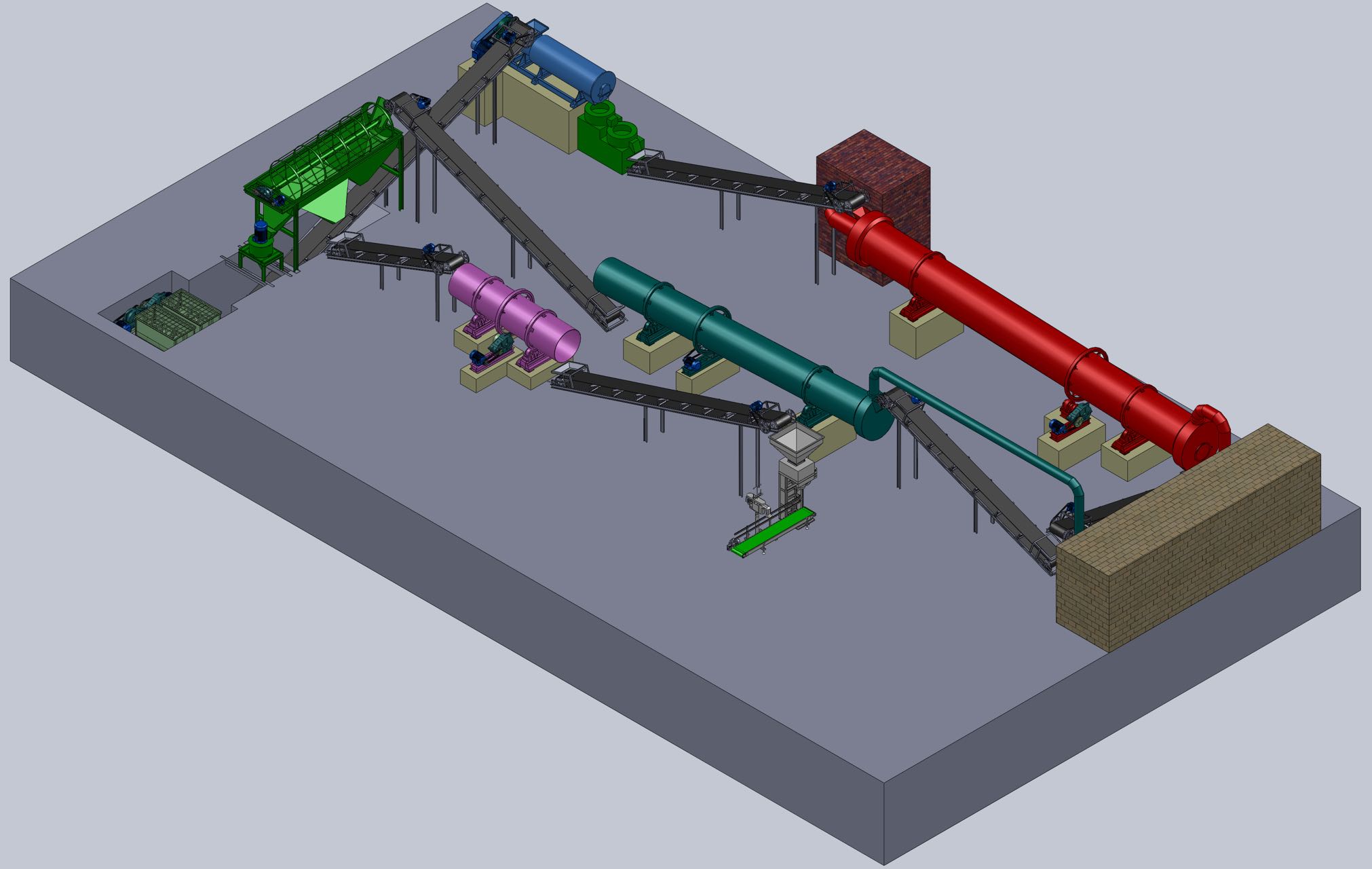 使用配料倉將堆肥后的物料和n、p、k等無機(jī)肥料及其他添加物等原料,按一定比例通過物料粉碎機(jī)和臥式混合機(jī),進(jìn)行粉碎、配比和混合。本系統(tǒng)作用是將堆肥后的物料和氮磷鉀無機(jī)肥料及其他添加物等各種原料按一定比例進(jìn)行粉碎、配比和混合。根據(jù)多年經(jīng)驗(yàn),設(shè)備配套建議如下:采用立式粉碎機(jī)粉碎牛糞堆肥物不易粘壁,不易堵塞,多層紊流鏈錘結(jié)構(gòu)改善粉碎性能;采用連續(xù)式自動(dòng)配料系統(tǒng)適合有機(jī)肥原料的動(dòng)態(tài)計(jì)量及配料控制;混合作業(yè)配置雙軸連續(xù)式混合機(jī),密封性好,粘濕物料不易在攪拌軸根部粘附。10萬噸粉狀有機(jī)肥生產(chǎn)線,5萬噸粉狀有機(jī)肥生產(chǎn)線,1萬噸粉狀有機(jī)肥生產(chǎn)線